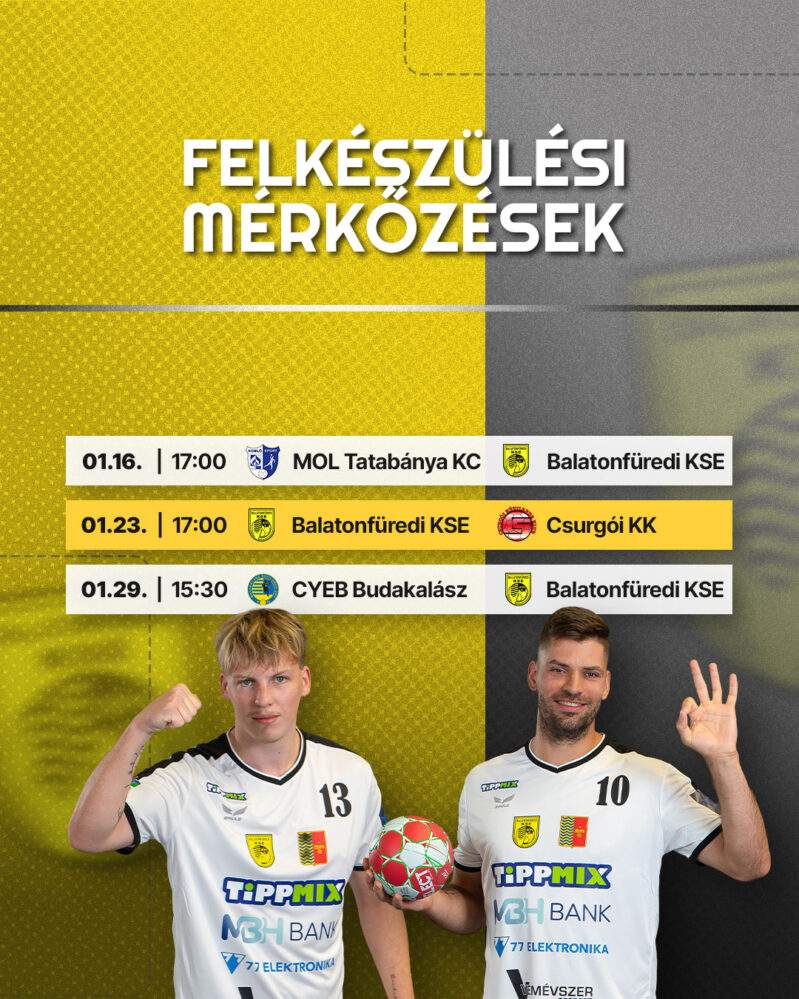 A Balatonfüredi KSE három felkészülési találkozóval hangol a februárban folytatódó hazai és nemzetközi küzdelmekre. Elsőként a K&H férfi liga jelenlegi harmadik helyezettje, a MOL Tatabánya KC otthonába látogatunk, majd egy hétre rá hazai pályán fogadjuk a velünk azonos pontszámmal álló Csurgót. Végül pedig a Budakalász ellen vívunk meg idegenben, akik ellen decemberben rendkívül kiélezett mérkőzésen tudtunk diadalmaskodni.